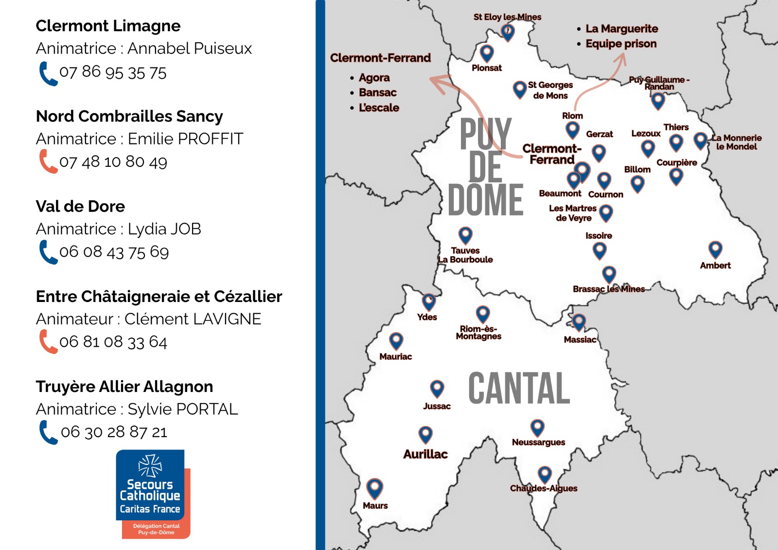 La délégation du Cantal Puy-de-Dôme, regroupe 2 départements : le Cantal et le Puy-de-Dôme. Avec ses 900 bénévoles et ses 10 salarié(e)s, la délégation se mobilise auprès des personnes en difficulté pour créer des dynamiques de solidarités et favoriser les échanges trouver des solutions. Avec ses 35 équipes locales et ses 36 lieux d'accueil, elles accompagnent, dans la durée, les personnes et les familles en situation de précarité